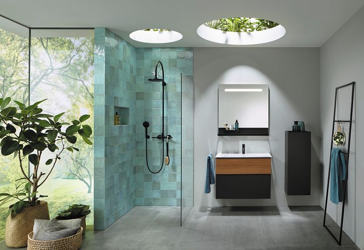 Elegantes Bicolor-Design bei der Einstiegsklasse zum Lifestyle-Bad: Mit Fronten in Graphit Softmatt und warmem Tectona Dekor Zimt wirkt die von Patrick Frey für burgbad entworfene neue Badmöbelkollektion Fiumo ausgesprochen elegant – etwa wie hier mit Plissee-Front am oberen Auszug, Plissee-Board mit Ablage-Reling am Leuchtspiegel und halbhohem Schrank.