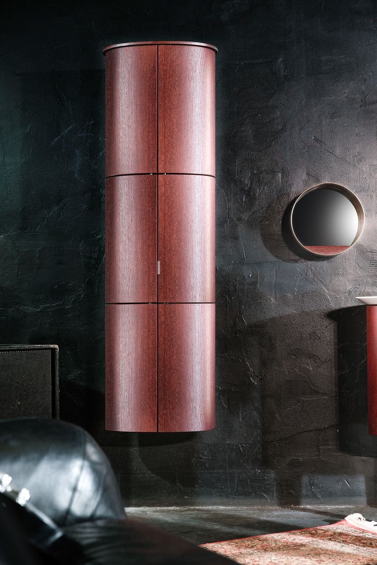 Ergänzt wird die Kollektion durch einen halbhohen, zweitürigen Schrank mit geradem Wandabschluss und Glaseinlegeböden sowie einem runden Ablagetisch mit einer in Quarz Metallic gerahmten Ablagefläche aus verspiegeltem Rauchglas.