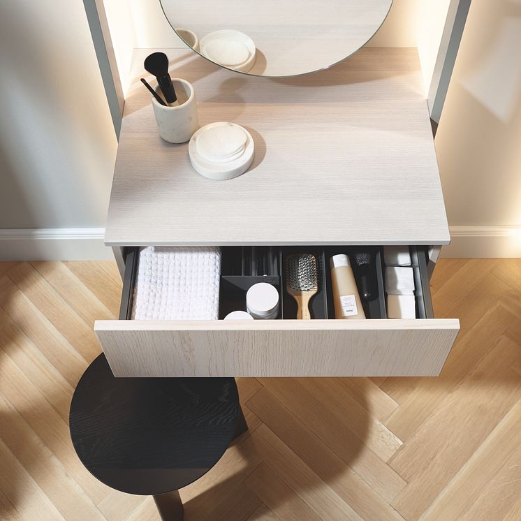 Bühne frei für den kleinen Auftritt: Die neuen schlanken Alurahmen-Module des erfolgreichen Möbelprogramms rc40 von burgbad stellen einen perfekt beleuchteten Schminkplatz vor die Wand – inklusive Ambiente-Beleuchtung und optimal organisiertem Stauraum.