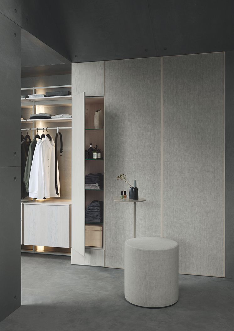 Geschlossenen und offenen Stauraum für moderne Wohnkonzepte, in denen Räume und Raumfunktionen individuell definiert werden können – zu realisieren mit dem Systemmöbelprogramm rc40 von burgbad. Die aktuellen Programmergänzungen beinhalten u.a. ein beleuchtetes Alurahmensystem für Schminkplätze, Garderoben oder das Innenleben von begehbaren Kleiderschränken, einen Schminkhocker sowie mit Funktionsstoff bespannte Alurahmentüren zum Schließen von Raumnischen.