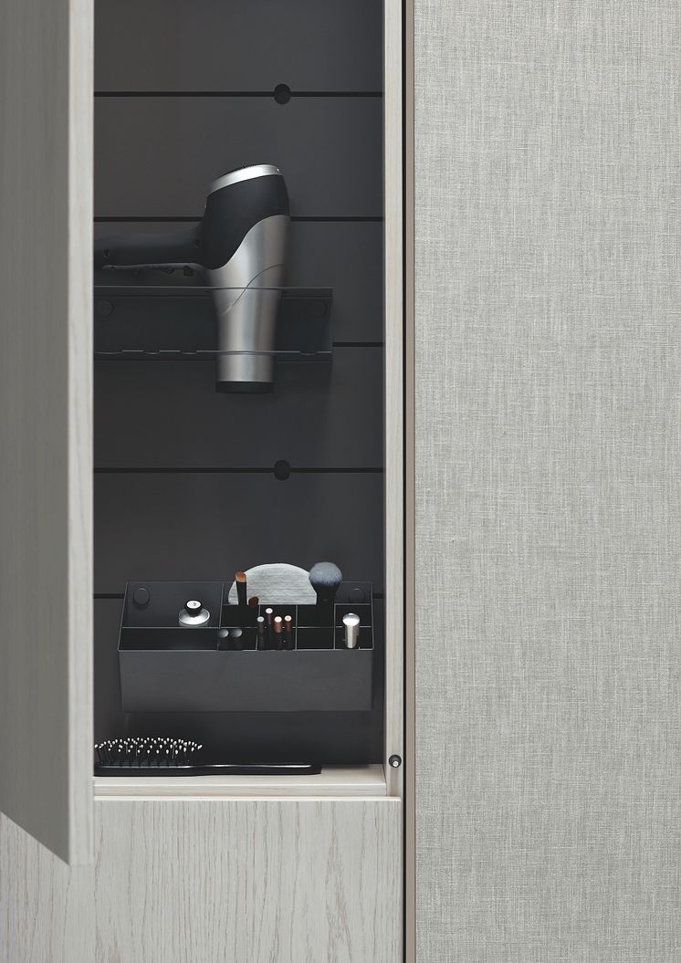 Bei den neuen Hochschränken des Programms rc40 von burgbad lassen sich Furnierfronten – hier im neuen, modern wirkenden Eiche Weiß– und luftige Alurahmentüren mit Funktionsstoffbespannung zu einer aufgelockerten Optik kombinieren. Modellabhängig bietet das neue Inneneinteilungssystem Sets aus Kästen, entnehmbarer Stiftebox, Ablagen und Fönhalter aus Metall, die über Nuten variabel zu positionieren sind.
