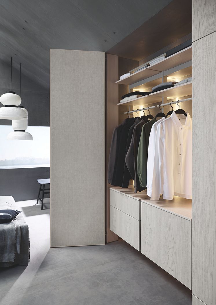 Mit seinen neuen Ergänzungen wie dem beleuchteten Alurahmensystem für perfekt organisierte begehbare Kleiderschränke und den mit Funktionsstoff bespannten Alurahmentüren (hier als zweiflügelige Faltschiebetür) zur Wandbefestigung löst das raumbildende Systemmöbelprogramm rc40 von burgbad die Grenze zwischen Badezimmer und Wohnbereich weiter auf.