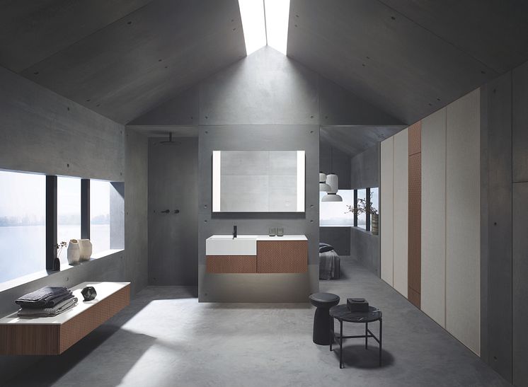Grenzenlose Möglichkeiten für offenes Wohnen: Der erfolgreiche Klassiker für moderne Wohnkonzepte, das Möbelsystemprogramm rc40 von burgbad, wird um eine Reihe von neuen Modulen, Funktionen und Oberflächen ergänzt – mit dem Furnier Nussbaum Sense, fugenlos glatten Waschtischen und mit Funktionsstoff bespannten Türen für Nischen und begehbare Kleiderschränke.
