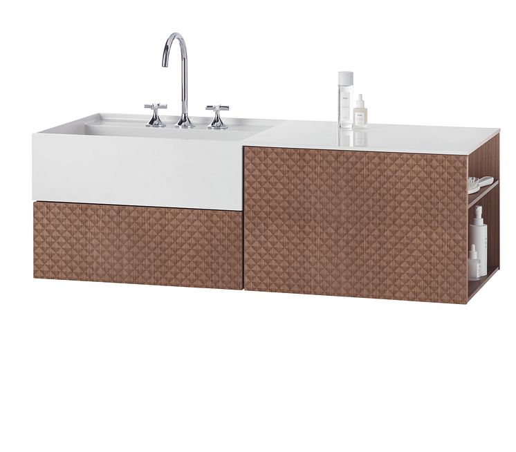 Für alle Sinne: Das neue Furnier Nussbaum Sense lässt mit seiner Diamantstruktur die schlichte Form des fugenlos gearbeiteten rc40-Mineralguss-Waschtischs besonders elegant wirken.