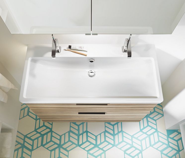 Der breite Doppelwaschtisch bietet auch bei hektischer Morgen-Toilette genügend Platz für alle Familienmitglieder und hat in seinen bis zu vier Schubladen ausreichend aufgeräumten Stauraum für Haar-Gel, Bodylotion, Handtücher & Co. Wer jedoch nicht ganz so viel Platz hat, dabei aber den lästigen Verkehrsstau bei Parallelnutzung vermeiden will, kann bei Eqio jetzt auch eine 1.030 mm breite Waschtischvariante in Keramikausführung bekommen, die mit zwei Hahnlöchern für zwei getrennte Armaturen versehen ist.