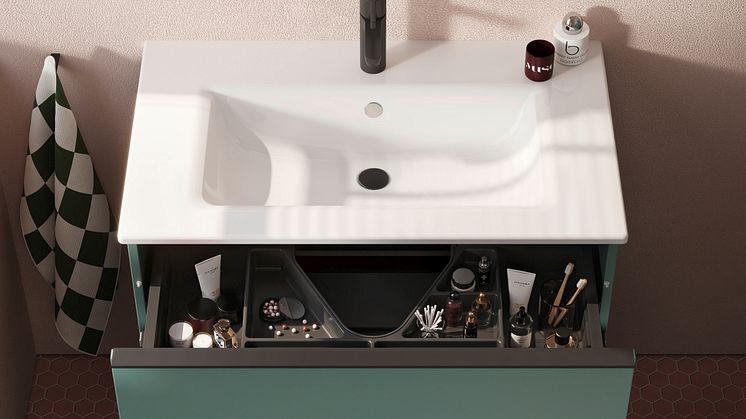 In besonderen „Engpässen“ im Grundriss hat das burgbad-Sortiment tiefenreduzierte Waschtische und maßflexible Badmöbel zur Auswahl. In der Regel bieten aber schon die Lieblingsbäder aus dem sys10-Segment genügend Maßoptionen selbst für sehr kleine Bäder. Stauraum ist hier besonders wichtig, um eine großzügig wirkende, aufgeräumte Optik zu erzielen. Schon die obere Schublade des Waschtischunterschranks erweist sich bei Eqio als Stauraumwunder, in dem clevere Fächereinteilungen Ordnung für die wichtigsten Dinge des Badezimmer-Alltags schaffen. Zudem macht sich der neuartige Siphon burgbad cleanFlow für überlauflochfreie Waschtische und Aufsatzwaschtische hier besonders schlank. Neben seiner Montagefreundlichkeit sorgt er dank seiner innovativen, patentierten Konstruktion für gute Raumluft, und da der hochliegende, gut erreichbare Siphon auch besonders reinigungsfreundlich und verstopfungsarm ist, kann der Einsatz von aggressiven Reinigungsmitteln reduziert werden – ein weiteres Plus für die Umwelt. Der in kleinen Bädern idealerweise als raumsparende Einbauvariante realisierte Spiegelschrank ist nicht nur wichtige Lichtquelle und spiegelnder Raumvergrößerer, sondern hält auch praktischen Stauraum auf Augenhöhe parat.