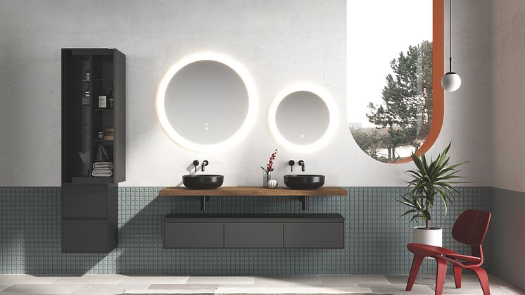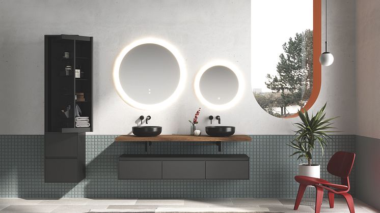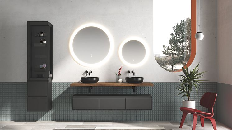 Den neuen rc40-Schrank wird es als halbhohes Modell und als Hochschrank geben – jeweils in einer sich nach rechts und einer sich nach links öffnenden Ausführung. Bei der Innenausstattung ist zwischen zwei unterschiedlichen Designs zu wählen: Bei der eher klassischen Ausführung bieten offene Regale viel Platz für Handtücher und Utensilien, bei der anderen erhält das Schrankmodul durch die eingefügte Zwischenwand eine vertikale Zweiteilung – mit einem durchgehend hohen Stauraum auf der einen und schmalen Regalen und Aufbewahrungsboxen für Tuben, Gläser und diverse Kleinteile auf der anderen Seite. Eine optionale Beleuchtung, die sich beim Dreh automatisch an- oder ausschaltet, setzt den Inhalt effektvoll in Szene, erleichtert die täglichen Pflegeroutinen und kann als emotionales Ambiente-Licht im Bad eingesetzt werden. Einen besonderen Luxus versprechen zwei beidseits eines Doppelwaschtischs platzierte Drehschränke: So kann gleich beiden Nutzern der Wunsch nach einem ganz eigenen, gut nutzbaren Raum für persönliche Gebrauchsgegenstände erfüllt werden.