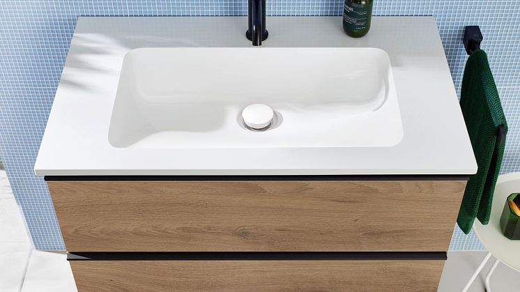 Der neue, ab 1. Mai lieferbare Flächenwaschtisch aus Mineralguss bietet ein gegenüber dem Vorgängermodell etwas großzügigeres Beckenvolumen mit steil und tief eintauchender Mulde. Neu ist auch eine Doppelwaschtischvariante in 102 und 122 cm Breite, die mit zwei Hahnlöchern und extra breiter Kumme ausgestattet ist (erhältlich ab 1. September 2024).