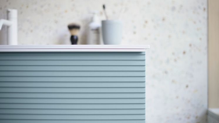 Fiumo bietet nicht nur optisch eine Vielfalt an bicolor kombinierbaren Farben und Dekoren, sondern auch eine haptisch außergewöhnliche Variante: Neben den glatten Oberflächen steht für den oberen Auszug in allen Oberflächenvarianten auch eine Front mit einer horizontalen Rillenstruktur zur Wahl. Die 3D-Front wirkt wie in Falten gelegt und schmiegt sich mit ihrem Licht- und Schattenspiel unter die leicht überstehende, dünn ausgeformte Waschtischkante. Die schmalen Griffleisten in Mattweiß oder -schwarz greifen die dezente Linienführung nochmals auf.
