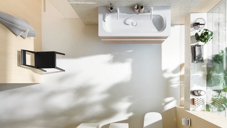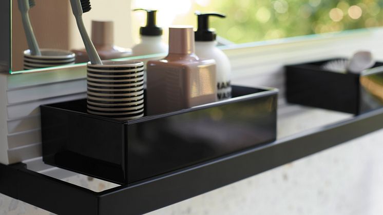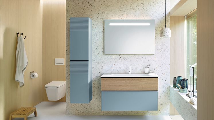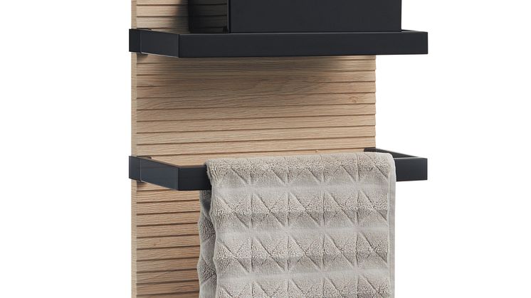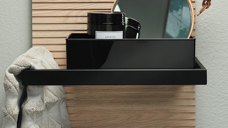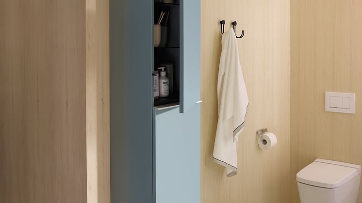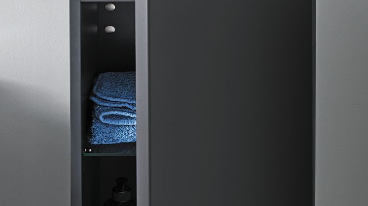 Für kompakten Stauraum sorgen ein Hochschrank in drei Frontvarianten sowie ein halbhoher Schrank mit oben eingesetzter Ablagebox (Breite 350 mm, Höhe 1160 mm bzw. 960 mm, Tiefe 320 mm). Ein flexibel mit Handtuchhalter und Ablagen zu bestückendes Wandpaneel (Breite 350 mm, Höhe 600 mm, Tiefe inkl. Halterungen und Ablagen 150 mm) erweitert das modulare Programm um eine moderne und selbst auf kleinstem Raum unterzubringende Stauraum-Variante. Damit deckt Fiumo mit wenigen Elementen die ganze Bandbreite an Einsatzmöglichkeiten ab: vom kleinen Gästebad über das kompakte Familienbad bis hin zum großzügigen Komfortbad.