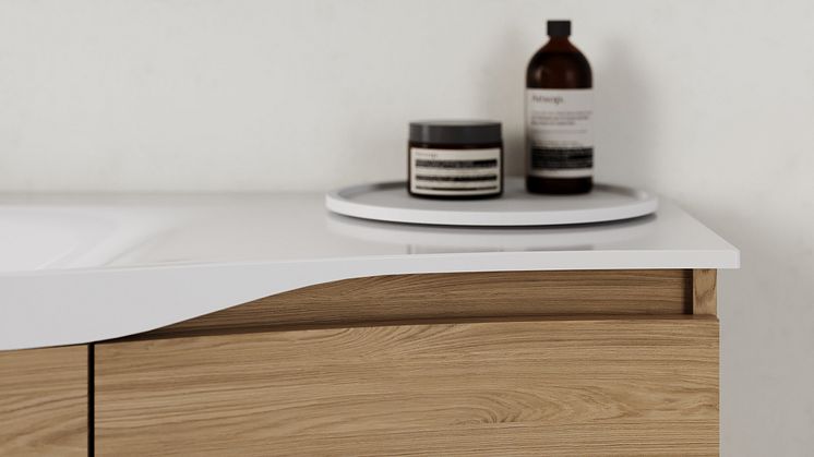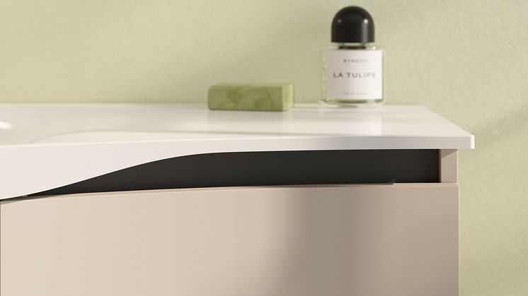 Wie ein Flügel schwebt der filigrane Mineralguss-Waschtisch über dem Korpus. Aus dem Rückschwung der sich auch nach oben verjüngenden Waschtischkante ergibt sich die seitliche Griffmulde. Optisch setzt sich damit der Schwungansatz der unteren Griffmulde fort, über die sich die beiden tiefen Auszüge öffnen lassen.