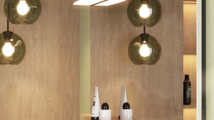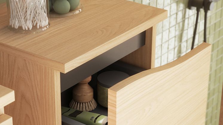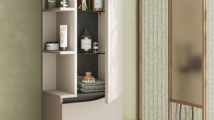 Die Kollektion bietet vielseitige Ablage- und Stauraum-Elemente, die sich modular ergänzen. So gibt es den wandhängenden Hochschrank in einer schmalen und einer etwas breiteren Variante mit seitlich integriertem, offenem Regal, und der halbhohe Schrank wird in einer Variante mit einer metallenen Ablageschale aufgewertet. Die mit Ablage wählbaren Wandspiegel und die Spiegelschränke –ausgestattet mit in der Lichttemperatur steuerbaren LED-Aufsatzleuchten und in jeweils zum Waschtisch passender Breite – bieten weitere Ablagemöglichkeiten und gut strukturierten Stauraum. Mit den passenden Handtuchhaltern aus schwarzem Metall lassen sich seitlich an Schrank oder Ablage auch die Badtextilien griffbereit unterbringen.
