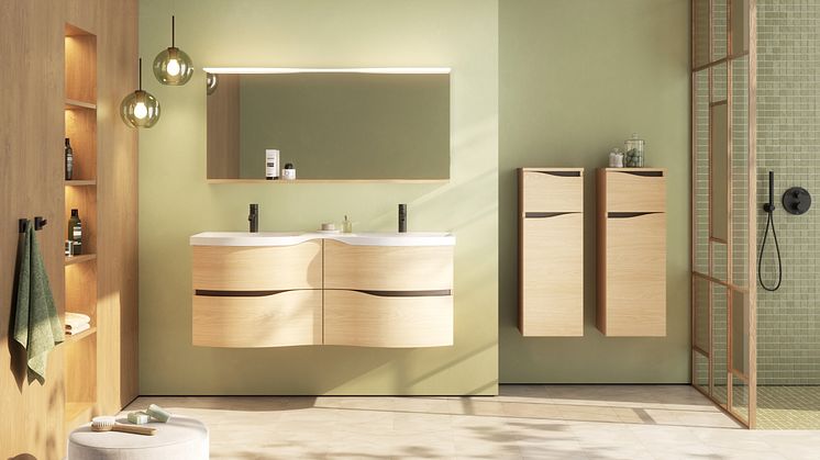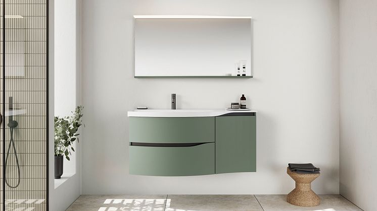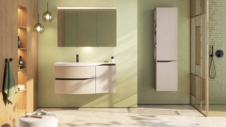 Inspiriert von weitläufigen Landschaften mit sanften, sich hintereinander schmiegender Hügelkuppen zieht sich das dreidimensionale Wechselspiel von konkaven und konvexen Formen und horizontalen Linien über das gesamte Programm von Sinea 3.0: Mal wölben sich Möbelfront und Waschtischkante vor, mal weichen sie sich verjüngend zurück und bieten so ein Optimum an randnah realisiertem Beckenvolumen und seitlicher Ablagefläche. Auch Ablage und Lichtsegel von Wandspiegel und Spiegelschrank folgen diesem rhythmischen Richtungswechsel: Während die über der Armatur tiefenreduzierte Spiegelablage Bewegungsfreiraum schafft, wölbt sich das darüber schwebende Lichtsegel wieder vor, um das Gesicht von oben optimal auszuleuchten. Die Schränke nehmen das horizontale Wellenlinien-Design durch den Dekorverlauf und die markanten Griffmulden auf.