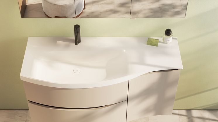 Das Design von Sinea 3.0 wirkt harmonisch und großzügig. Durch sein asymmetrisch tiefenreduziertes Layout lässt sich das Waschtisch-Ensemble aber auch raumsparend in kleinen Bädern und engen Raumsituationen einsetzen. Sinea 3.0 schafft dabei mit einer einheitlichen Waschtischkombinationshöhe von 540 mm reichlich Stauraum und lässt gleichzeitig komfortablen Bewegungsfreiraum ohne störende Ecken und Kanten: weich geschwungen, nahbar, einladend.