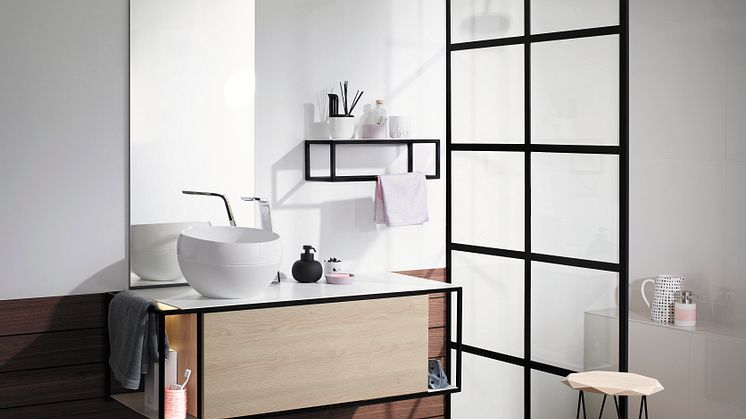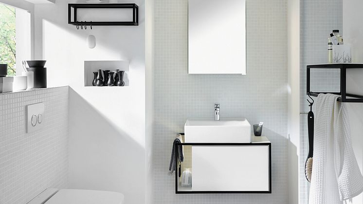 Ein besonders spielerisches und luftiges Element für die Badgestaltung liefert Junit mit der kubisch gestalteten Wandablage, die frei an der Wand positioniert werden kann. Die schlanke Metallrahmenkonstruktion passt in fast jede Ecke, wirkt ausgesprochen grafisch und dekorativ und mausert sich in Kombination mit dem aufgesetzten Leuchtspiegel zu einem auch optisch sehr reduzierten Schminkplatz.