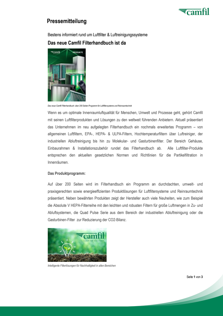 Wenn es um optimale Innenraumluftqualität für Menschen, Umwelt und Prozesse geht, gehört Camfil mit seinen Luftfilterprodukten und Lösungen zu den weltweit führenden Anbietern. Aktuell präsentiert das Unternehmen im neu aufgelegten Filterhandbuch ein nochmals erweitertes Produktprogramm.