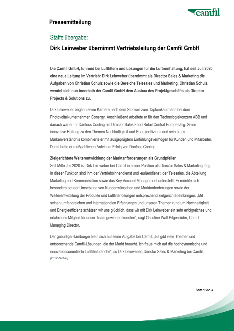 Die Camfil GmbH, führend bei Luftfiltern und Lösungen für die Luftreinhaltung, hat seit Juli 2020 eine neue Leitung im Vertrieb: Dirk Leinweber übernimmt als Director Sales & Marketing die Aufgaben von Christian Schulz sowie die Bereiche Telesales und Marketing. Christian Schulz, wendet sich nun innerhalb der Camfil GmbH dem Ausbau des Projektgeschäfts als Director Projects & Solutions zu.