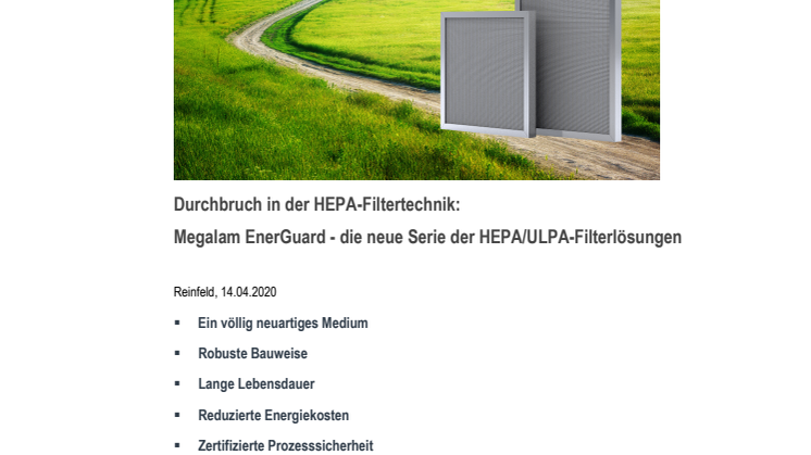 Als führender Hersteller erstklassiger Luftfiltersysteme für Reinräume stellt Camfil nach jahrelanger Forschung und Entwicklung eine umfassend neu entwickelte HEPA/ULPA-Luftfilterlösung vor: die Schwebstofffilter-Serie Megalam EnerGuard. Diese ist konsequent an den sich ändernden Bedürfnissen der Reinraumbranche ausgerichtet und setzt neue Maßstäbe – unter anderem bei der qualitativ hochwertigen Filtrationsleistung und der Senkung der Betriebskosten im Vergleich zu allen anderen HEPA-Filtern der Branche.