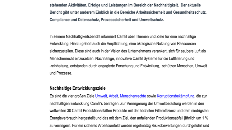 Nachhaltigkeit ist seit vielen Jahren fest mit den Werten und im Handeln bei Camfil verankert. Als global agierender Hersteller von Produktlösungen für Luftfiltersysteme und Reinraumtechnik gestaltet Camfil den tiefgreifenden Wandel einer nachhaltigen Entwicklung aktiv mit. Im veröffentlichten Nachhaltigkeitsbericht für das Geschäftsjahr 2019 dokumentiert das Unternehmen seine weltweiten, im Einklang mit den Zielen der Vereinten Nationen stehenden Aktivitäten, Erfolge und Leistungen im Bereich der Nachhaltigkeit. Der aktuelle Bericht gibt unter anderem Einblick in die Bereiche Arbeitssicherheit und Gesundheitsschutz, Compliance und Datenschutz, Prozesssicherheit und Umweltschutz.