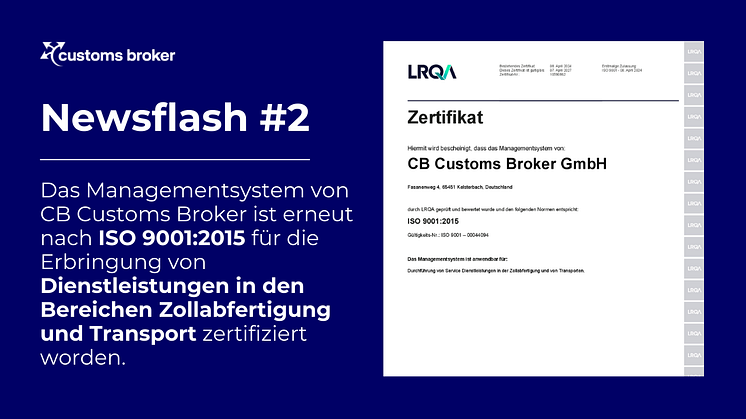 LRQA zertifiziert CB Customs Broker nach ISO 9001:2015