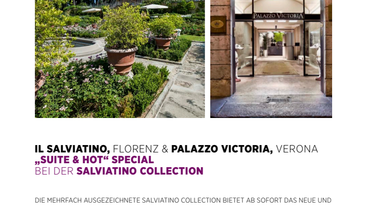 Die mehrfach ausgezeichnete Salviatino Collection bietet ab sofort das neue und exklusive „Suite & Hot“ Package im Il Salviatino in Florenz sowie im Palazzo Victoria in Verona an. Dieses Angebot ist bis 31. August 2014 gültig und kann auf Anfrage mit dem „Exclusively Salviatino Experiences“ Arrangement kombiniert werden.