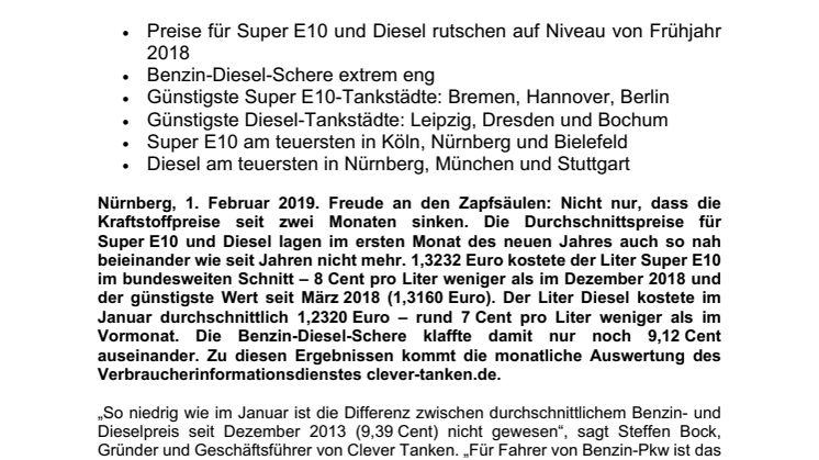 Nürnberg, 1. Februar 2019. Freude an den Zapfsäulen: Nicht nur, dass die Kraftstoffpreise seit zwei Monaten sinken. Die Durchschnittspreise für Super E10 und Diesel lagen im ersten Monat des neuen Jahres auch so nah beieinander wie seit Jahren nicht mehr. 1,3232 Euro kostete der Liter Super E10 im bundesweiten Schnitt – 8 Cent pro Liter weniger als im Dezember 2018 und der günstigste Wert seit März 2018 (1,3160 Euro). Der Liter Diesel kostete im Januar durchschnittlich 1,2320 Euro – rund 7 Cent pro Liter weniger als im Vormonat. Die Benzin-Diesel-Schere klaffte damit nur noch 9,12 Cent auseinander. Zu diesen Ergebnissen kommt die monatliche Auswertung des Verbraucherinformationsdienstes clever-tanken.de.