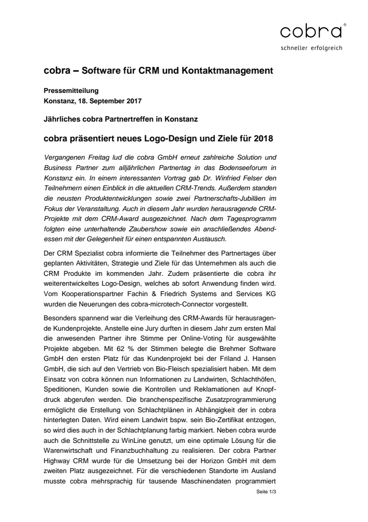 Vergangenen Freitag lud die cobra GmbH erneut zahlreiche Solution und Business Partner zum alljährlichen Partnertag in das Bodenseeforum in Konstanz ein. Im Fokus der Veranstaltung standen die neusten Produktentwicklungen sowie zwei Partnerschafts-Jubiläen. Auch in diesem Jahr wurden herausragende CRM-Projekte mit dem CRM-Award ausgezeichnet.