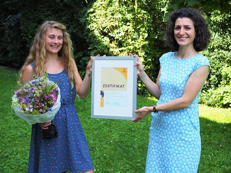 Christina Schuh (li.) erhält von Serap Meral (re.), Account Manager Clinics von Cochlear Deutschland, das Cochlear™ Graeme Clark Stipendium 2021