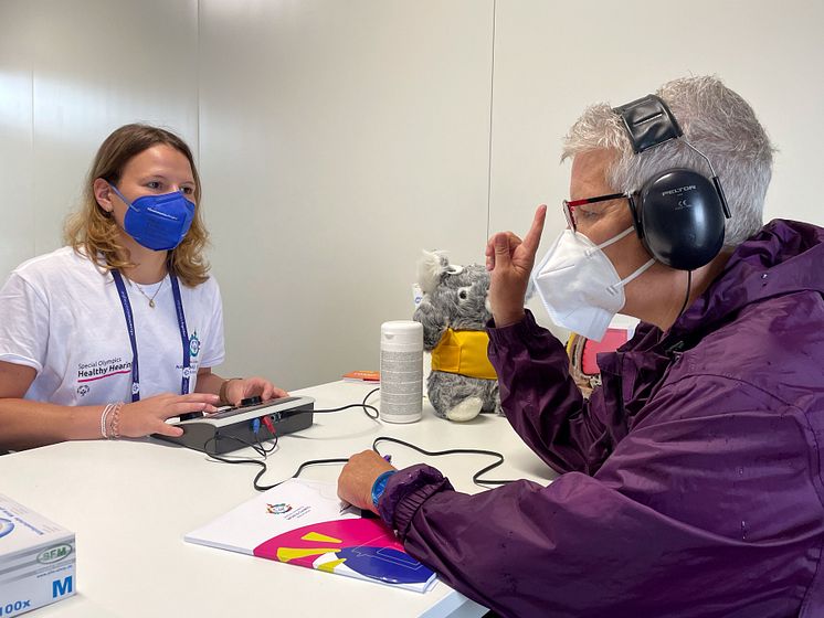 Cochlear engagiert sich beim Programm Healthy Hearing der Special Olympics - Carmen Armbruster, Account Manager Acousticians bei Cochlear Deutschland, während der Durchführung eines Hörtests (Foto: Cochlear)