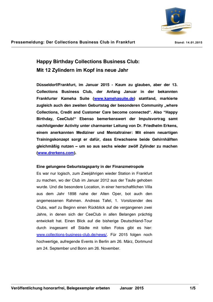 Kaum zu glauben, aber der 13. Collections Business Club, der Anfang Januar in der bekannten Frankfurter Kameha Suite (www.kamehasuite.de) stattfand, markierte zugleich auch den zweiten Geburtstag der besonderen Community „where Collections, Credit and Customer Care become connected“. Also “Happy Birthday, CeeClub!“