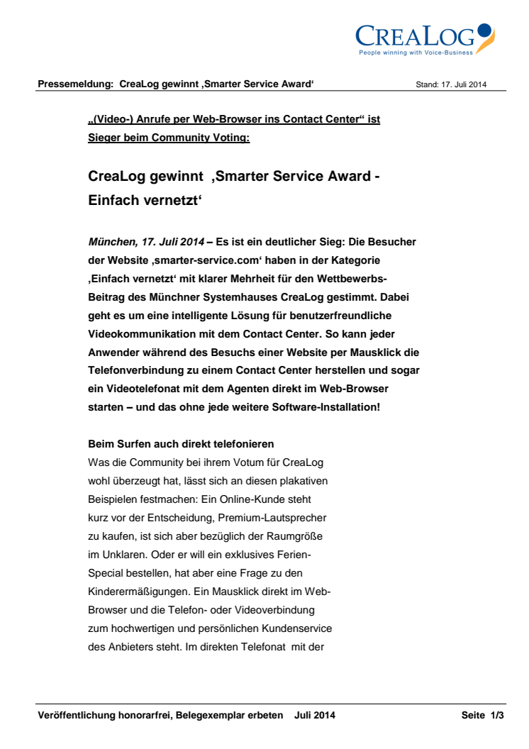 Es ist ein deutlicher Sieg: Die Besucher der Website ‚smarter-service.com‘ haben in der Kategorie 'Einfach vernetzt' mit klarer Mehrheit für den Wettbewerbs-Beitrag des Münchner Systemhauses CreaLog gestimmt. Dabei geht es um eine intelligente Lösung für benutzerfreundliche Videokommunikation mit dem Contact Center.