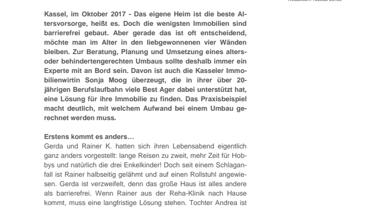 Kassel, im Oktober 2017 - Das eigene Heim ist die beste Altersvorsorge, heißt es. Doch die wenigsten Immobilien sind barrierefrei gebaut. Aber gerade das ist oft entscheidend, möchte man im Alter in den liebgewonnenen vier Wänden bleiben. Zur Beratung, Planung und Umsetzung eines alters- oder behindertengerechten Umbaus sollte deshalb immer ein Experte mit an Bord sein. Davon ist auch die Kasseler Immobilienwirtin Sonja Moog überzeugt, die in ihrer über 20-jährigen Berufslaufbahn viele Best Ager dabei unterstützt hat, eine Lösung für ihre Immobilie zu finden. Das Praxisbeispiel macht deutlich, mit welchem Aufwand bei einem Umbau gerechnet werden muss.