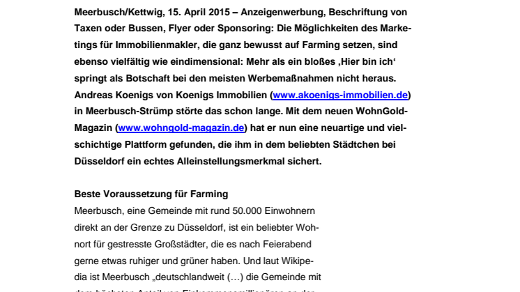 Meerbusch/Kettwig, 15. April 2015 – Anzeigenwerbung, Beschriftung von Taxen oder Bussen, Flyer oder Sponsoring: Die Möglichkeiten des Marketings für Immobilienmakler, die ganz bewusst auf Farming setzen, sind ebenso vielfältig wie eindimensional: Mehr als ein bloßes ‚Hier bin ich‘ springt als Botschaft bei den meisten Werbemaßnahmen nicht heraus. Andreas Koenigs von Koenigs Immobilien (www.akoenigs-immobilien.de) in Meerbusch-Strümp störte das schon lange. Mit dem WohnGold-Magazin (www.wohngold-magazin.de) hat er nun eine neuartige und vielschichtige Plattform gefunden, die ihm in dem beliebten Städtchen bei Düsseldorf ein echtes Alleinstellungsmerkmal sichert.