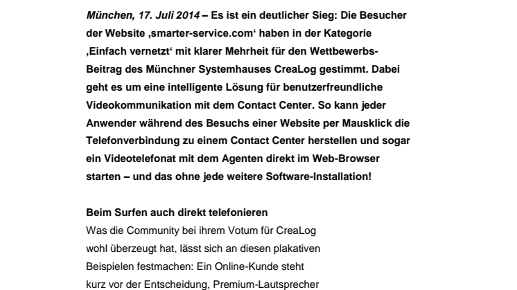 München, 17. Juli 2014 – Es ist ein deutlicher Sieg: Die Besucher der Website ‚smarter-service.com‘ haben in der Kategorie 'Einfach vernetzt' mit klarer Mehrheit für den Wettbewerbs-Beitrag des Münchner Systemhauses CreaLog gestimmt. Dabei geht es um eine intelligente Lösung für benutzerfreundliche Videokommunikation mit dem Contact Center. So kann jeder Anwender während des Besuchs einer Website per Mausklick die Telefonverbindung zu einem Contact Center herstellen und sogar ein Videotelefonat mit dem Agenten direkt im Web-Browser starten - und das ohne jede weitere Software-Installation!