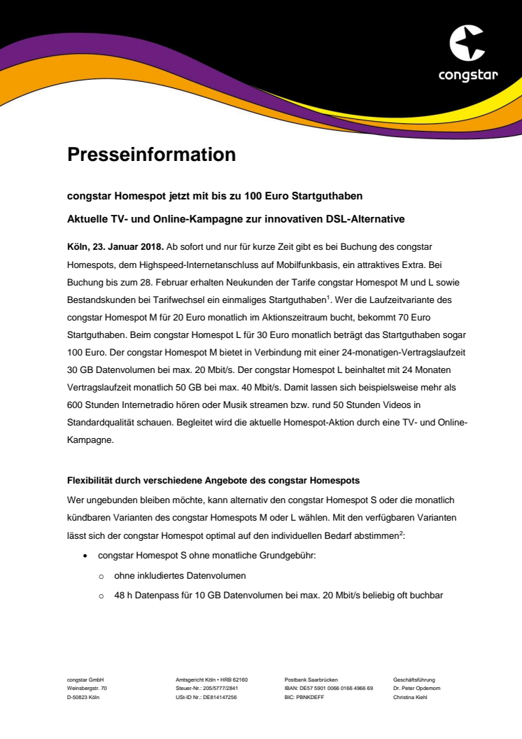congstar Homespot jetzt mit bis zu 100 Euro Startguthaben - Aktuelle TV- und Online-Kampagne zur innovativen DSL-Alternative