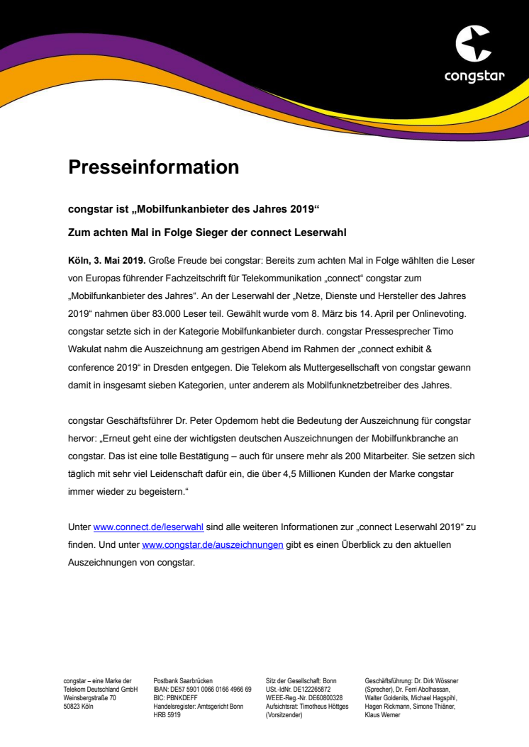 congstar ist „Mobilfunkanbieter des Jahres 2019“