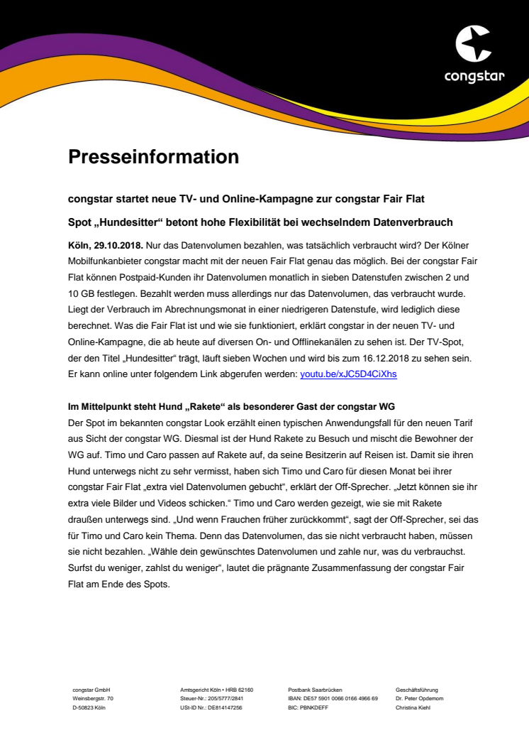 congstar startet neue TV- und Online-Kampagne zur congstar Fair Flat