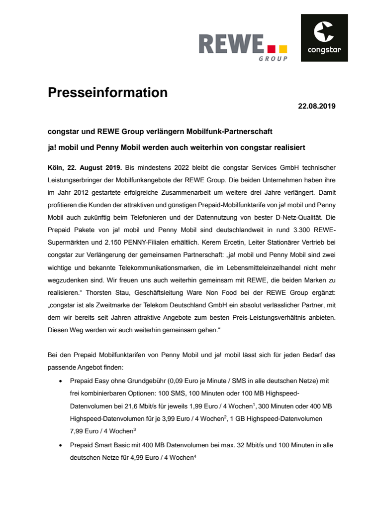 congstar und REWE Group verlängern Mobilfunk-Partnerschaft