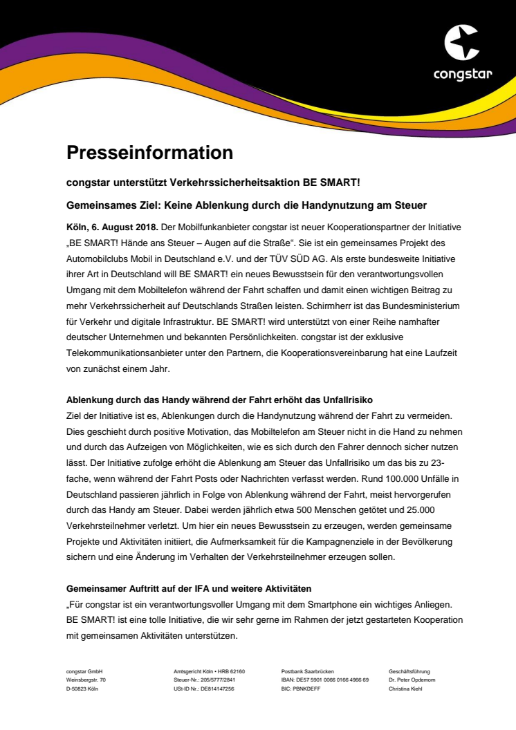 congstar unterstützt Verkehrssicherheitsaktion BE SMART!
