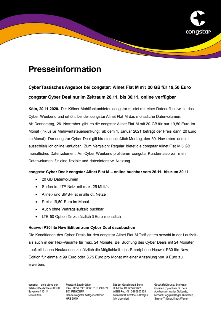 CyberTastisches Angebot bei congstar: Allnet Flat M mit 20 GB für 19,50 Euro