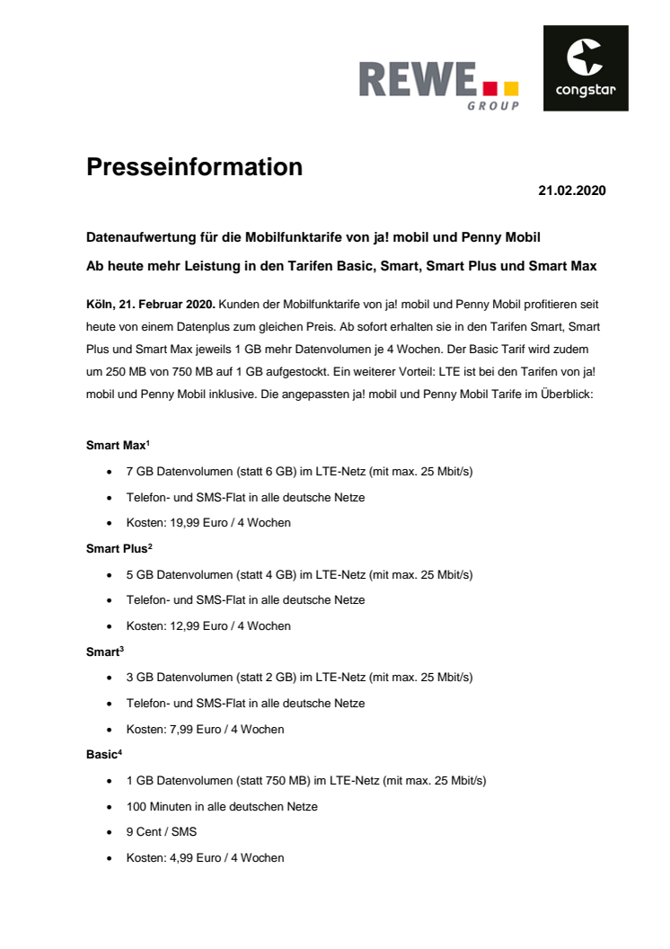 Datenaufwertung für die Mobilfunktarife von ja! mobil und Penny Mobil
