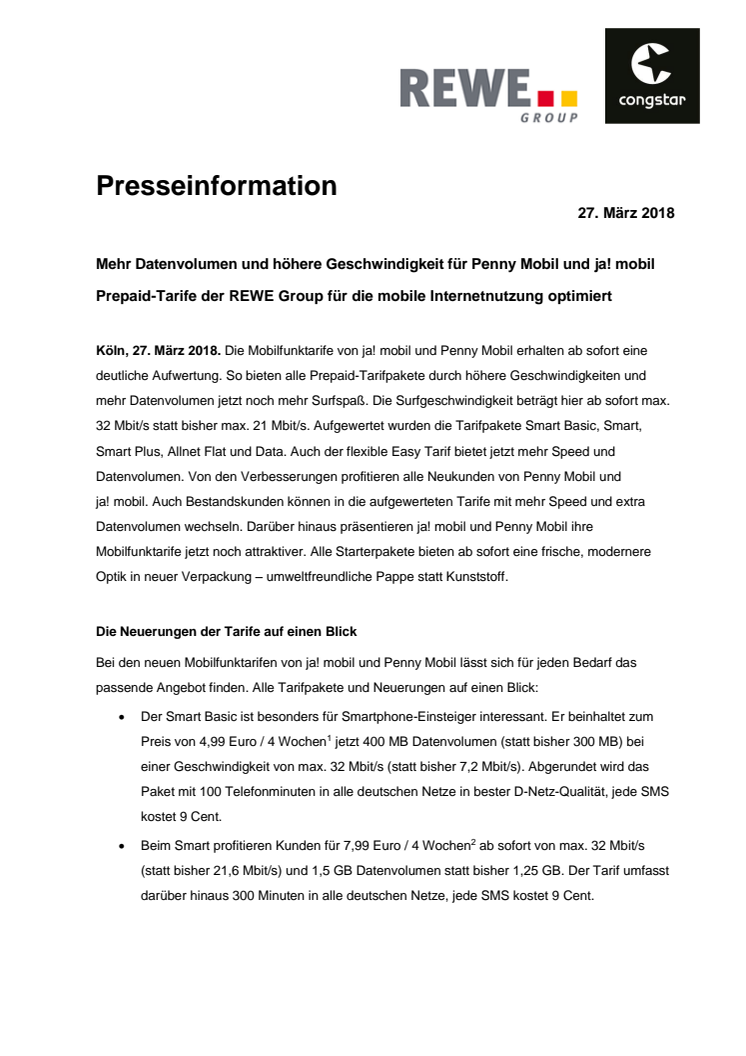 Mehr Datenvolumen und höhere Geschwindigkeit für Penny Mobil und ja! mobil