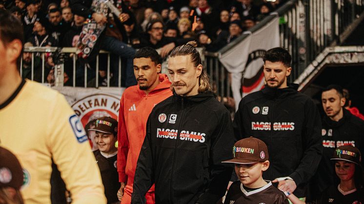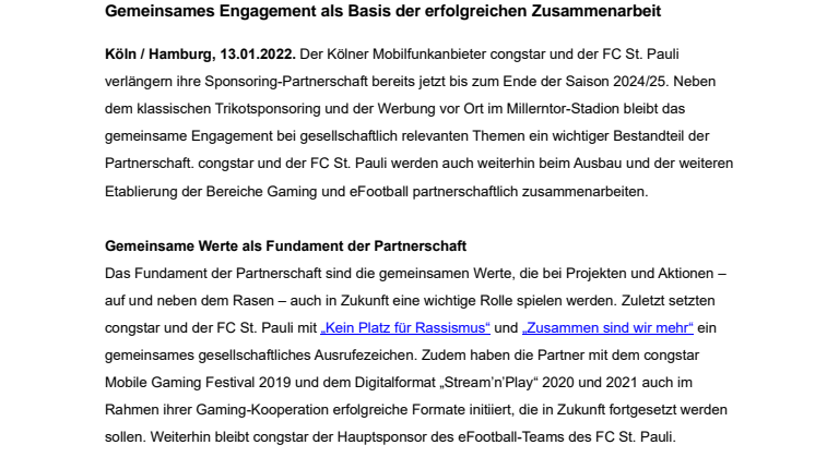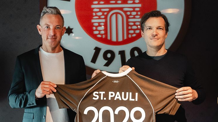 congstar Geschäftsführer Axel Orbach (links) und Wilken Engelbracht, kaufmännischer Geschäftsleiter beim FC St. Pauli (rechts), unterzeichneten die bis 2028 laufende Sponsoring-Vereinbarung im Vorfeld des Heimspiels gegen den FC Hansa Rostock