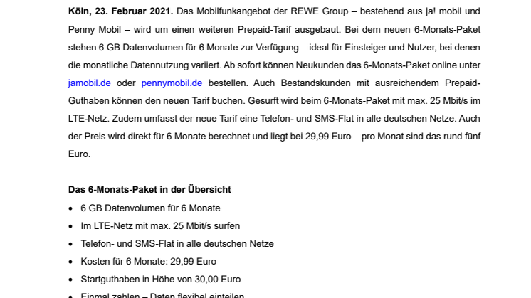 Köln, 23. Februar 2021. Das Mobilfunkangebot der REWE Group – bestehend aus ja! mobil und Penny Mobil – wird um einen weiteren Prepaid-Tarif ausgebaut. Bei dem neuen 6-Monats-Paket stehen 6 GB Datenvolumen für 6 Monate zur Verfügung – ideal für Einsteiger und Nutzer, bei denen die monatliche Datennutzung variiert. Ab sofort können Neukunden das 6-Monats-Paket online unter jamobil.de oder pennymobil.de bestellen. Auch Bestandskunden mit ausreichendem Prepaid-Guthaben können den neuen Tarif buchen. Gesurft wird beim 6-Monats-Paket mit max. 25 Mbit/s im LTE-Netz. Zudem umfasst der neue Tarif eine Telefon- und SMS-Flat in alle deutschen Netze. Auch der Preis wird direkt für 6 Monate berechnet und liegt bei 29,99 Euro – pro Monat sind das rund fünf Euro.