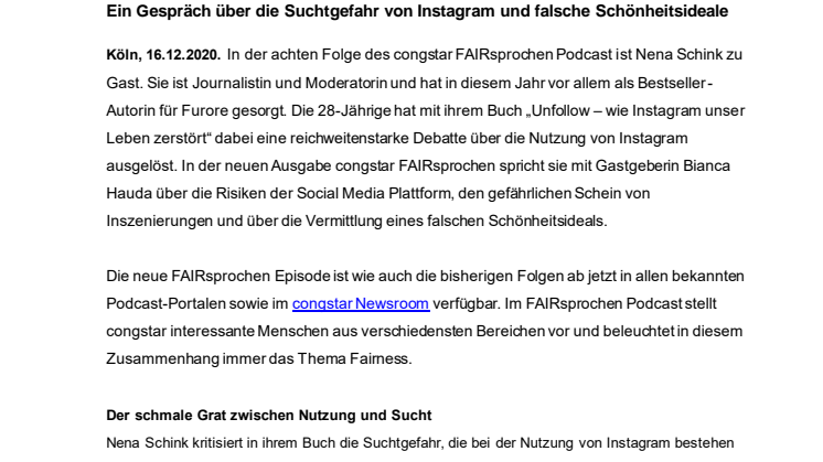 Köln, 16.12.2020. In der achten Folge des congstar FAIRsprochen Podcast ist Nena Schink zu Gast. Sie ist Journalistin und Moderatorin und hat in diesem Jahr vor allem als Bestseller-Autorin für Furore gesorgt. Die 28-Jährige hat mit ihrem Buch „Unfollow – wie Instagram unser Leben zerstört“ dabei eine reichweitenstarke Debatte über die Nutzung von Instagram ausgelöst.