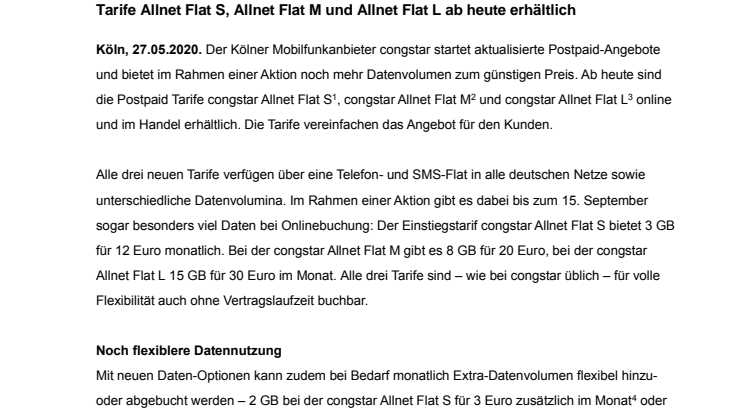 Köln, 27.05.2020. Der Kölner Mobilfunkanbieter congstar startet aktualisierte Postpaid-Angebote und bietet im Rahmen einer Aktion noch mehr Datenvolumen zum günstigen Preis. Ab heute sind die Postpaid Tarife congstar Allnet Flat S, congstar Allnet Flat M und congstar Allnet Flat L online und im Handel erhältlich.