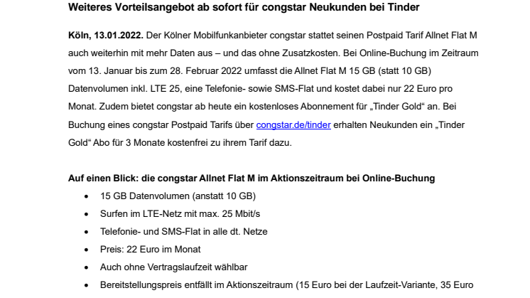 Heute startet auch ein neues, exklusives Angebot mit der Dating-App Tinder, das bis zum 2. März 2022 gilt. Bei Online-Buchung eines congstar Postpaid Tarifs über congstar.de/tinder oder mit Tarifabschluss bei einem teilnehmenden congstar Fachhändler erhalten interessierte Neukunden ein „Tinder Gold“ Abo für 3 Monate kostenfrei dazu.