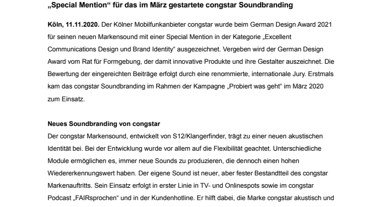Köln, 11.11.2020. Der Kölner Mobilfunkanbieter congstar wurde beim German Design Award 2021 für seinen neuen Markensound mit einer Special Mention in der Kategorie „Excellent Communications Design und Brand Identity“ ausgezeichnet. Vergeben wird der German Design Award vom Rat für Formgebung, der damit innovative Produkte und ihre Gestalter auszeichnet. Die Bewertung der eingereichten Beiträge erfolgt durch eine renommierte, internationale Jury. Erstmals kam das congstar Soundbranding im Rahmen der Kampagne „Probiert was geht“ im März 2020 zum Einsatz.