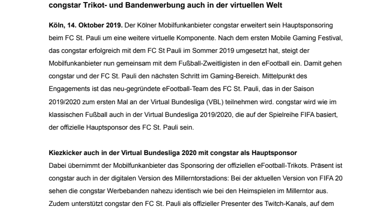Köln, 14. Oktober 2019. Der Kölner Mobilfunkanbieter congstar erweitert sein Hauptsponsoring beim FC St. Pauli um eine weitere virtuelle Komponente. Nach dem ersten Mobile Gaming Festival, das congstar erfolgreich mit dem FC St Pauli im Sommer 2019 umgesetzt hat, steigt der Mobilfunkanbieter nun gemeinsam mit dem Fußball-Zweitligisten in den eFootball ein. Damit gehen congstar und der FC St. Pauli den nächsten Schritt im Gaming-Bereich. Mittelpunkt des Engagements ist das neu-gegründete eFootball-Team des FC St. Pauli, das in der Saison 2019/2020 zum ersten Mal an der Virtual Bundesliga (VBL) teilnehmen wird. congstar wird wie im klassischen Fußball auch in der Virtual Bundesliga 2019/2020, die auf der Spielreihe FIFA basiert, der offizielle Hauptsponsor des FC St. Pauli sein.