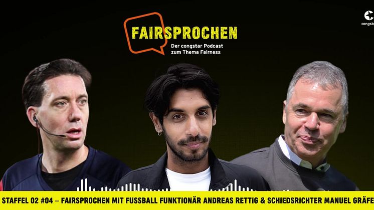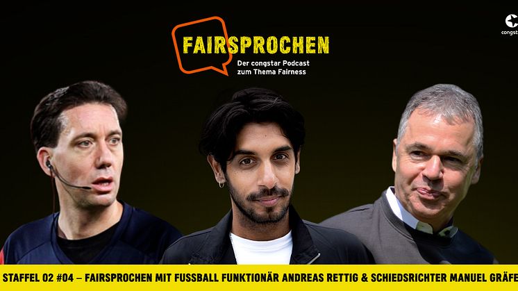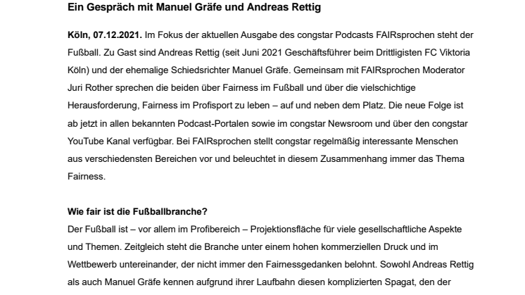 Köln, 07.12.2021. Im Fokus der aktuellen Ausgabe des congstar Podcasts FAIRsprochen steht der Fußball. Zu Gast sind Andreas Rettig (seit Juni 2021 Geschäftsführer beim Drittligisten FC Viktoria Köln) und der ehemalige Schiedsrichter Manuel Gräfe. Gemeinsam mit FAIRsprochen Moderator Juri Rother sprechen die beiden über Fairness im Fußball und über die vielschichtige Herausforderung, Fairness im Profisport zu leben – auf und neben dem Platz.